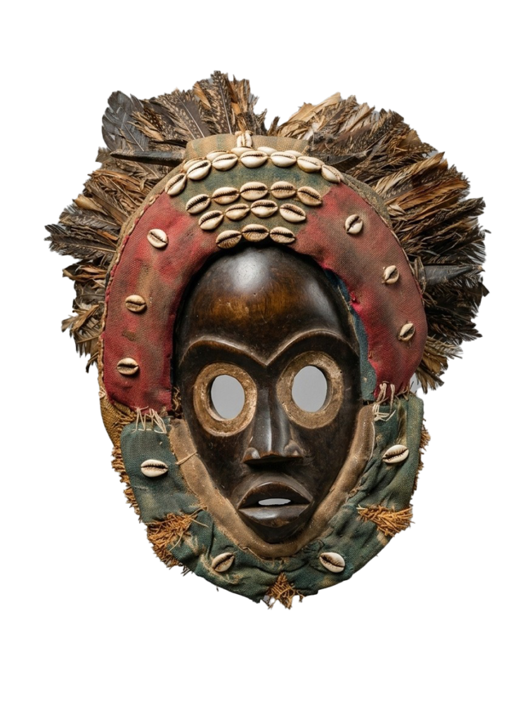 Masque de Prestige Dan-Wè – Côte d’Ivoire – Cauris, Plumes et Parure Textile
