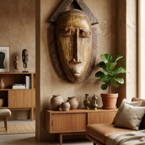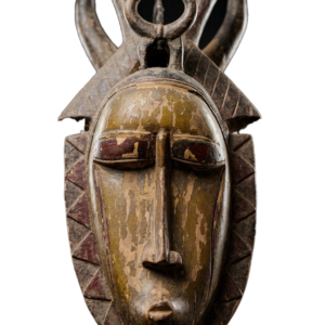 Masque africain ancien attribué au style Baoulé, originaire de Côte d’Ivoire. Sculpté dans un bois dense patiné par le temps, il se distingue par ses traits équilibrés, ses scarifications traditionnelles et son expression sereine. Une pièce authentique, idéale pour collectionneurs ou amateurs d’art africain.